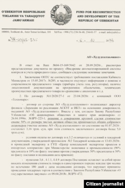 6 октябрь санаси қўйилган хатида жамғарма раҳбари Texnopark МЧЖ билан тузилган шартнома бўйича қатор жиддий эътирозларни билдирган.
