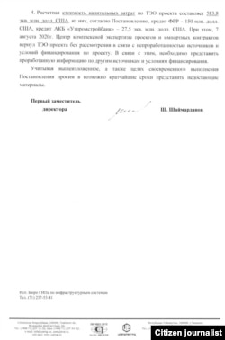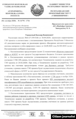 Бу мактуб ҳам 6 октябрь санаси билан ëзилган ва унда АСКУГ лойиҳаси ижроси юзасидан берилган сўров ва маълумотларнинг 24 сентябрь куни қабул қилинган президент қарорига номутаносиблиги кўрсатилган.