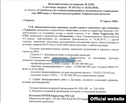 Enter Engineering ва “Ягона буюртмачи хизмати” УК ўртасида 2/304 деб рақамланган қўшимча келишувда махсус шифохонанинг 1000 ўринли қисмини қуриш нархи икки баравардан кўпроққа қимматлайди ва бирламчи 106 483 366 599 сўмлик нарх энди 245 872 135 358 сўмга кўтарилади. Келишувнинг бошқа шартлари ўзгаришсиз қолдирилади.