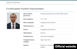 Очиқ манбалардан олинган маълумотларга кўра¸ сирдарëлик сенатор ҳозирга қадар Ўзбекистонда рўйхатга олинган қирққа яқин компания таъсисчисидир. Бу компаниялардаги “бизнес шериги” Насипа Сотиболдиева. Фамилиядошлигига қараганда, бу аëл бевосита оила аъзоси.