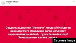 “Озодлик” радиосини фитначиликда айблайдиган кишилар! Нега Озодликни ёлғон маълумот тарқатишда айблаб, судга бермайсизлар? Хожаларингни кети очилди”.